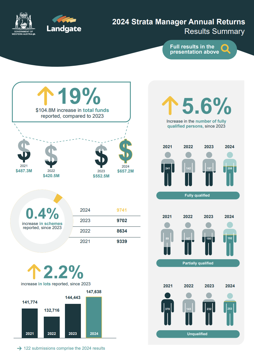 The 2023 Strata Manager Annual Return findings are now available. Landgate has compiled the results of the 2023 annual returns into an infographic comprising topline insights, as well as a more detailed presentation which includes analysis of responses across all sections of the survey.